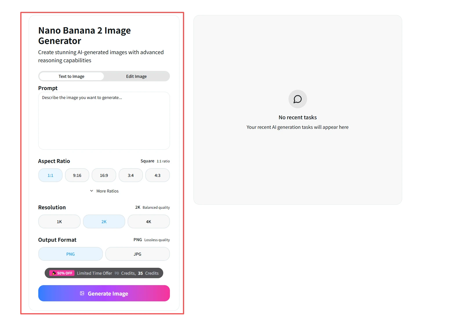 ์ธํฐํ์ด์ค์์ "Image Generation" (์ด๋ฏธ์ง ์์ฑ) ๋ชจ๋๋ฅผ ์ ํํ๋์ง ํ์ธํ์ญ์์ค. ๊ธฐ์กด ์ด๋ฏธ์ง๋ฅผ ์์ ํ๋ ค๋ฉด **"Image Editing" (์ด๋ฏธ์ง ํธ์ง)**์ ์ ํํ๊ณ ๊ธฐ๋ณธ ์ด๋ฏธ์ง๋ฅผ ์ ๋ก๋ํ์ญ์์ค.
